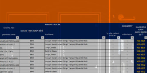 Proje planları üzerinden yangın dayanımlı kapı, ahşap kapı, sac kapı ve otomatik kapı tipleri işaretlenir. İşaretlenen kapılara uygun kapı aksesuar setleri HW-KK setleri belirlenir. Her bir kapı tipinde, hangi kapı aksesuarlarının olacağı, kapı kasa kanat özellikleri, mahal adları belirlenerek excel dosyası oluşturulur. Mimar, mühendis, teknik ofis çalışanları için bu çalışma ihale hazırlıklarında, fiyatlandırma ve üretim listelerinin hazırlanmasında kolaylık sağlamakta ve zaman kazandırmaktadır. İşletme ihtiyaçlarına uygun master anahtar planlarının çalışması bu liste üzerinden çalışılabilir. İhale aşamasından, üretici firma imalatı, sahada montaj ve montaj sonrası iş teslimindeki hakkediş planlarında bu listelerden faydalanılmaktadır.