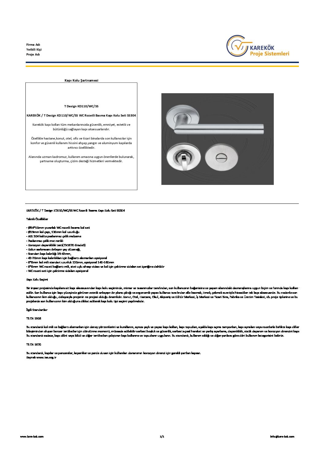 KAREKÖK / T Design KD110/WC/SS Teknik Şartname